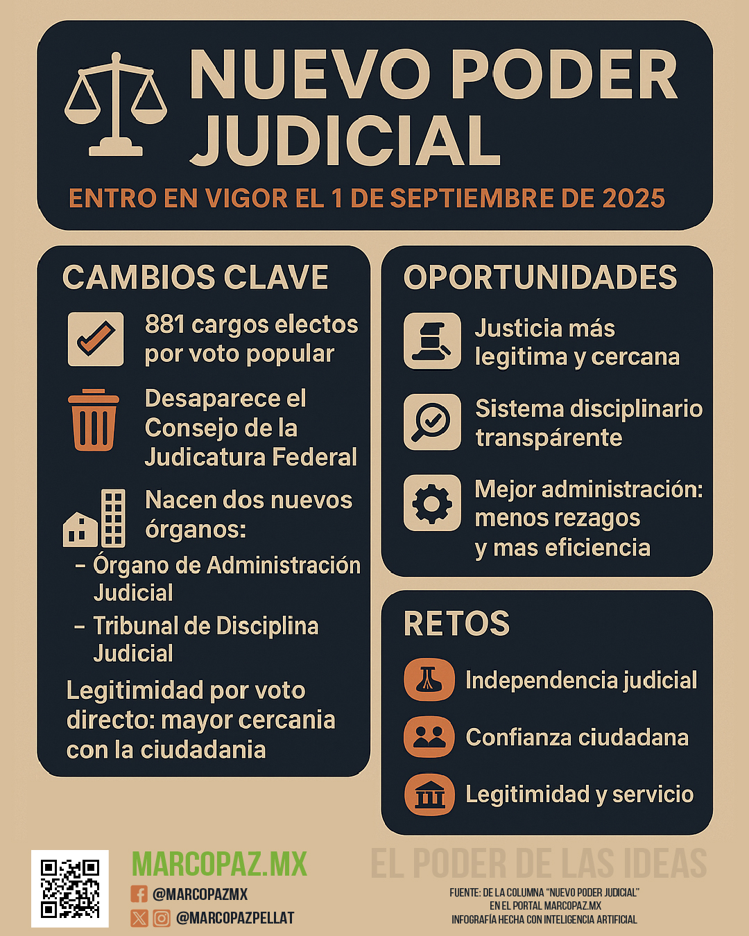 A partir del 1 de septiembre de 2025, México estrenó un nuevo Poder Judicial. Ese día entraron en funciones los primeros 881 jueces, magistrados y ministras(os) electos por voto popular, una reforma inédita que promete mayor cercanía con la ciudadanía. Se trata del arranque práctico de la criticada reforma constitucional publicada en septiembre de 2024, cuya primera elección organizó el INE en junio de este año. La segunda fase de este proceso ocurrirá en 2027.