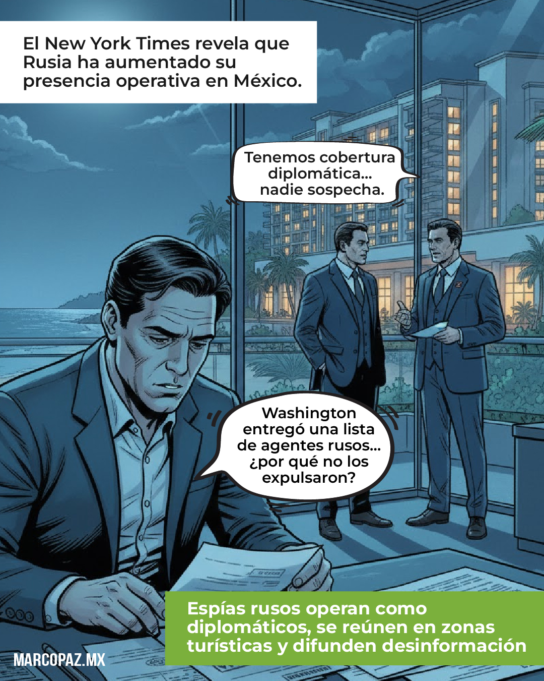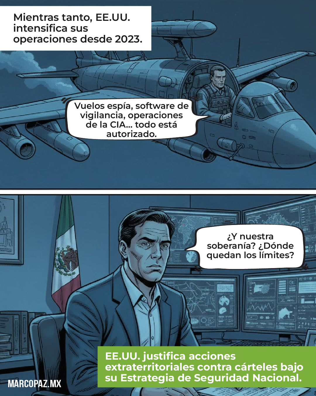 De acuerdo con el NYT, Rusia ha ampliado discretamente su presencia operativa en México mediante espías acreditados como diplomáticos, reuniones encubiertas en centros turísticos y campañas de desinformación dirigidas a audiencias mexicanas. Washington incluso entregó al gobierno mexicano una lista de agentes rusos activos, sin lograr su expulsión. En paralelo, Estados Unidos realiza vuelos espía, usa software de vigilancia desde territorio nacional y ejecuta operaciones encubiertas de la CIA, ahora respaldadas por su Estrategia de Seguridad Nacional, que considera a los cárteles mexicanos amenazas estratégicas y justifica acciones extraterritoriales.