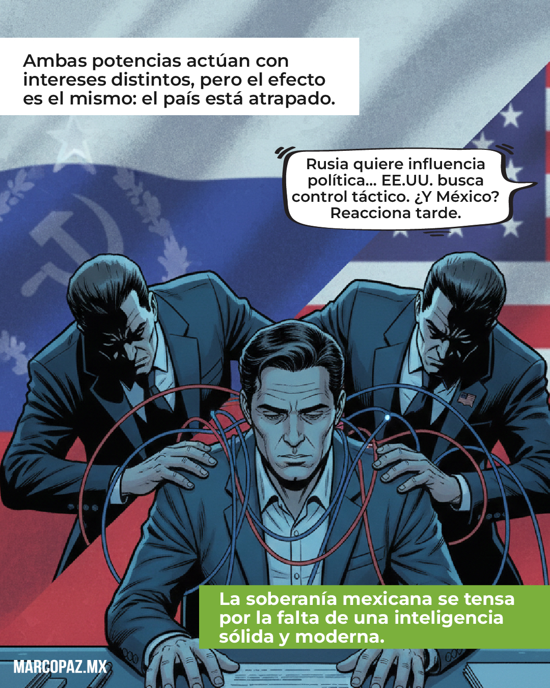 El resultado es un país sometido a presiones simultáneas: Rusia busca influencia política y capacidad de penetración informativa, mientras Estados Unidos actúa con fines tácticos y de contención criminal, aunque con niveles variables de transparencia. En ambos casos, la soberanía mexicana se ve tensada porque el Estado carece de una arquitectura de inteligencia sólida, moderna y capaz de enfrentar estas dinámicas.