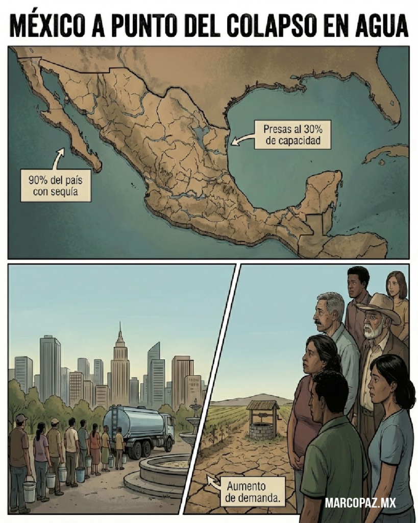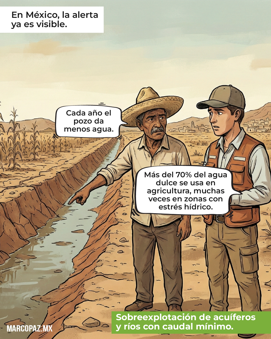 Para México, esta alerta no es abstracta. Más del 70% del agua dulce se destina a la agricultura, muchas veces en regiones con estrés hídrico severo. El resultado es un patrón cada vez más visible: acuíferos sobreexplotados, ríos con caudales mínimos, suelos degradados y ciudades que viven bajo la amenaza del “Día Cero”, cuando el agua simplemente ya no alcanza para cubrir lo básico.