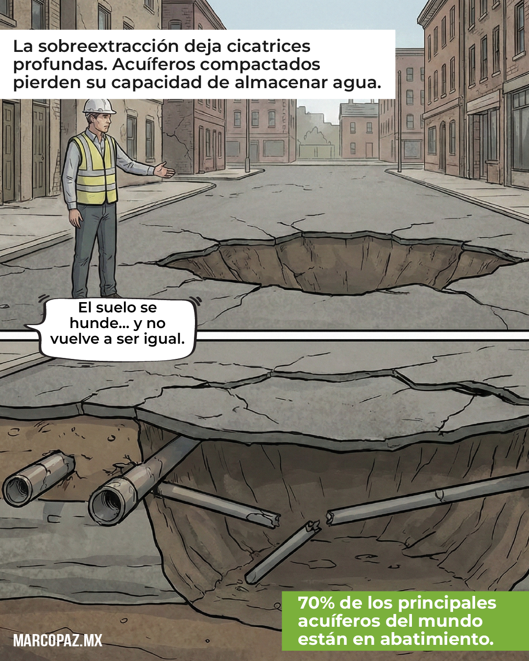 El informe de la ONU subraya que cerca del 70% de los principales acuíferos del mundo presentan tendencias de abatimiento a largo plazo. México no es la excepción. La sobreextracción de agua subterránea ya provoca hundimientos de suelo, daños a infraestructura, mayor riesgo de inundaciones y pérdida irreversible de capacidad de almacenamiento natural. Esto se traduce en costos más altos para el abasto, la producción de alimentos y la estabilidad de comunidades enteras.