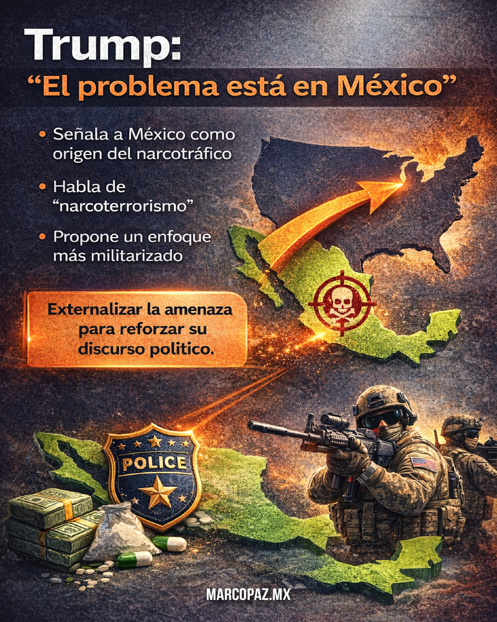 Trump apuesta por una fórmula eficaz en términos electorales: externalizar la amenaza. Su mensaje es simple, emocional y fácil de comunicar: el problema está fuera de Estados Unidos y debe enfrentarse con fuerza. En días recientes, funcionarios de la Casa Blanca, junto con mandos del Comando Sur de los Estados Unidos y del Departamento de Defensa de los Estados Unidos, endurecieron el lenguaje y defendieron una visión más militarizada del combate a los cárteles. Esa narrativa le permite a Trump reforzar su imagen de mando, conectar con su base política y justificar mayores exigencias hacia México.